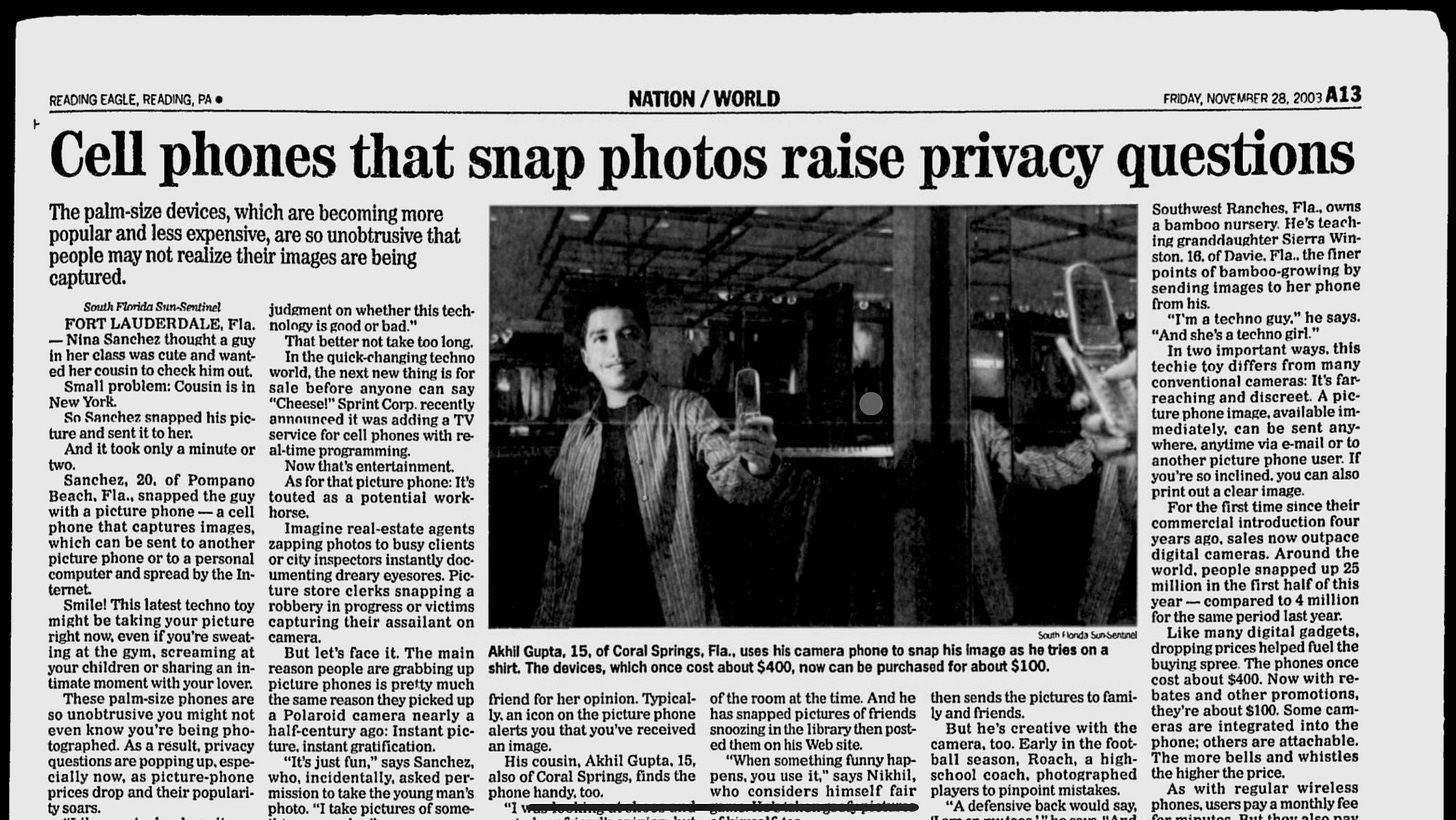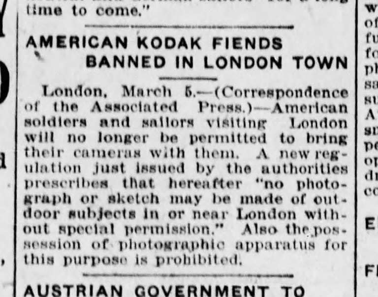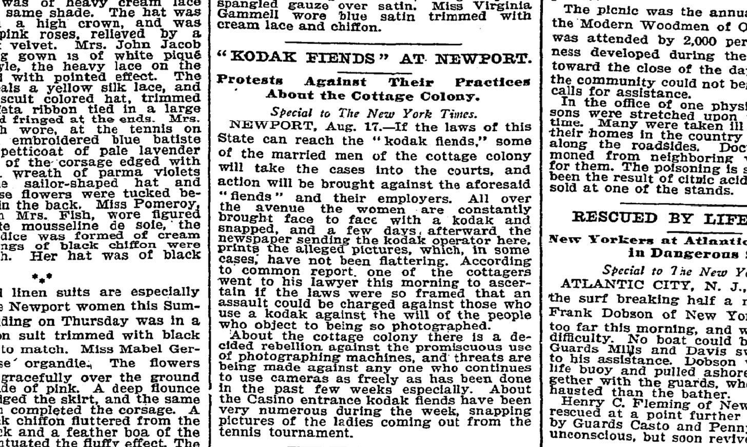 The first cheap portable cameras spawned the term ‘Kodak Fiends’, camera wielding men invading public places and capturing unwitting members of public on film. Concerns lead to laws against use in public spaces.