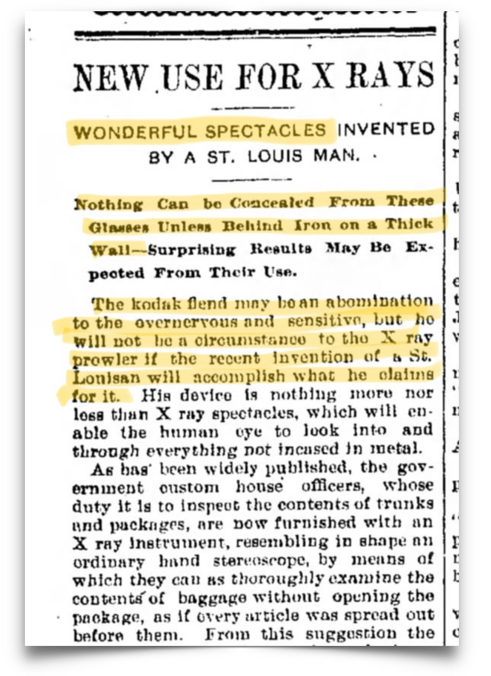 Amazingly around the time of concerns about ‘Kodak Men’, augmented reality glasses caused concern too. In the example below X-Ray glasses - announced by an inventor.