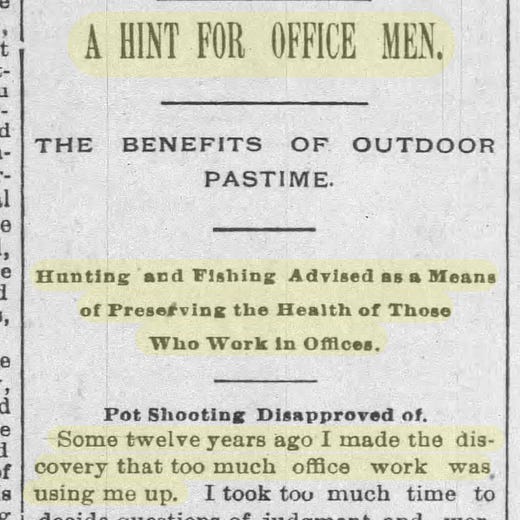 We found this fun 1891 article by an office worker - who claimed his familial genes made it an unnatural habitat for him - he advised âoffice menâ go hunting to retain their sanity.