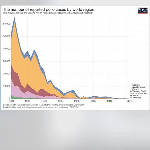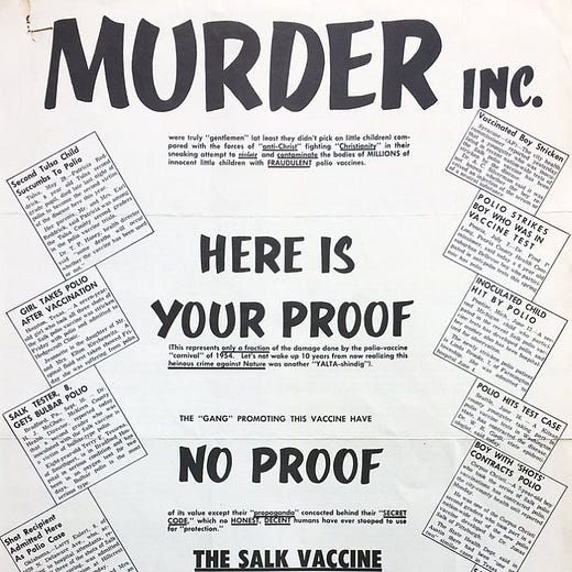 After stumbling upon a anti-polio vaccine poster, we thought itβd be a fun juxtaposition to place it next to a chart showing the drop in cases over time. The poster included many clippings of irresponsible media reporting on suspected, but unproven reactions to polio vaccinations. Similar reporting is used by anti-vaxxers today.