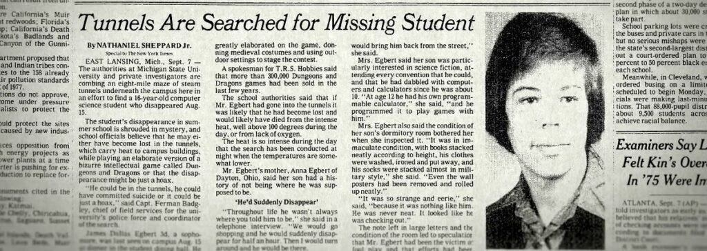 Satanism concerns lingered through the 1970s, perpetuated by Manson trial headlines, former satanist ‘high priest’ Mike Warnke’s hoax memoir The Satan Seller, and hit films like The Exorcist and The Omen. In 1979 a new fangled game called Dungeons & Dragons - already linked to occultism - would be falsely tied to a missing-person case. (it’d later inspire 1982 TV movie ‘Mazes and Monsters’ featuring a young Tom Hanks.)