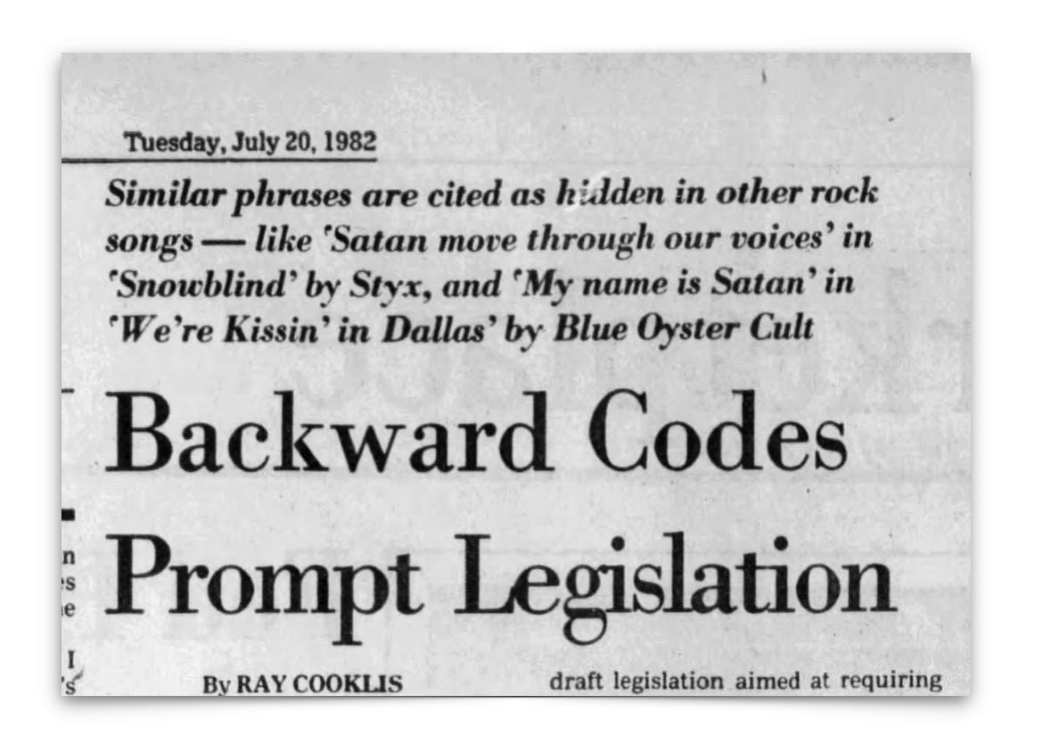 1982 would see accusations of ‘back masking’ in rock music - secret satanic messages when played backwards - such as “Satan move through our voices” and “My Name is Satan”, bringing increased focus on music as a vehicle of satanic influence.