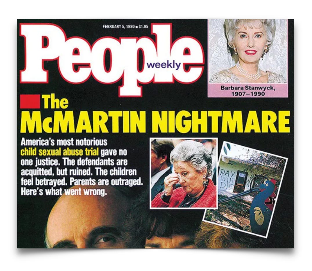 Satanic panic would spike further - in 1983 - when the Los Angeles D.A. brought charges against local daycare ‘McMartin Preschool’ for satanic ritual abuse that included reports of flying witches - in what became the longest, costliest series of trials in U.S. history.