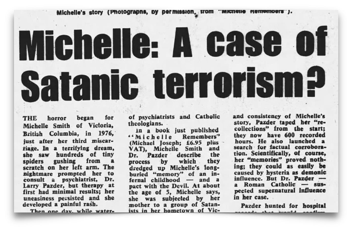 The 1980s kicked off with a new supposed ‘expose’ of satanism ‘Michelle Remembers’ (1980) by psychiatrist Lawrence Pazder and his patient, Michelle Smith, who claimed to have recalled repressed memories of Satanic ritual abuse.